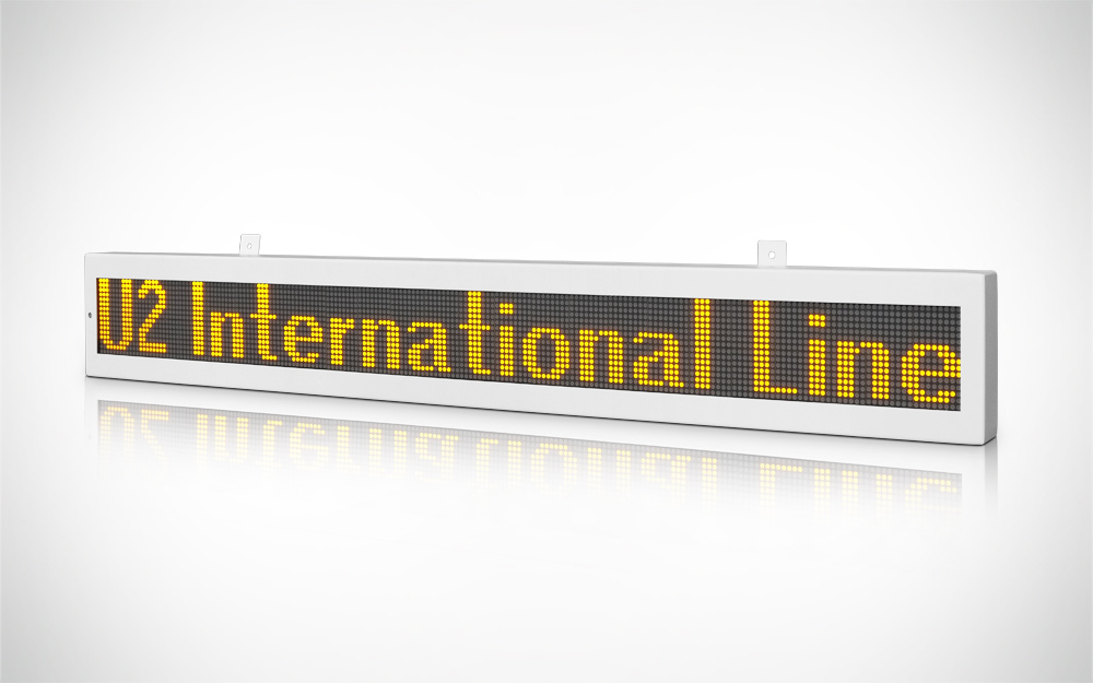 Bustec LED indoor displays provide a compact design, long service life, and low operating costs through efficient multi-color LEDs and automatic dimming. They support stop-request confirmation on integrated or separate displays with proportional lettering up to 30 characters, pictograms, digits, and scrolling text. Designed for easy integration, they offer 38 mm font height and modular multi-line resolutions that fit any vehicle interior. Standard interfaces (IBIS, RS485, Ethernet) enable straightforward on-board control, while multiple housing colors ensure a perfect aesthetic match.